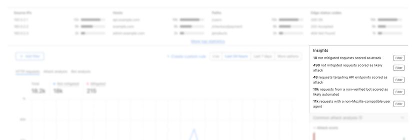 As mentioned above, besides like application focus as a starting point, a combination of different perspectives allows users to pick out anomalies that requires attention. With the introduction of the new intelligence and internal knowledge of common attack vectors, a new widget was created within a day that wasn't part of the original proposal, but solely based on the internal testings. This new widget is named "Insights", sitting higher up above the fold, highlighting requests counts of hand crafted combinations of filters. With this addition, we invited few more internal testers to validate this assumption and the outcome was positive.