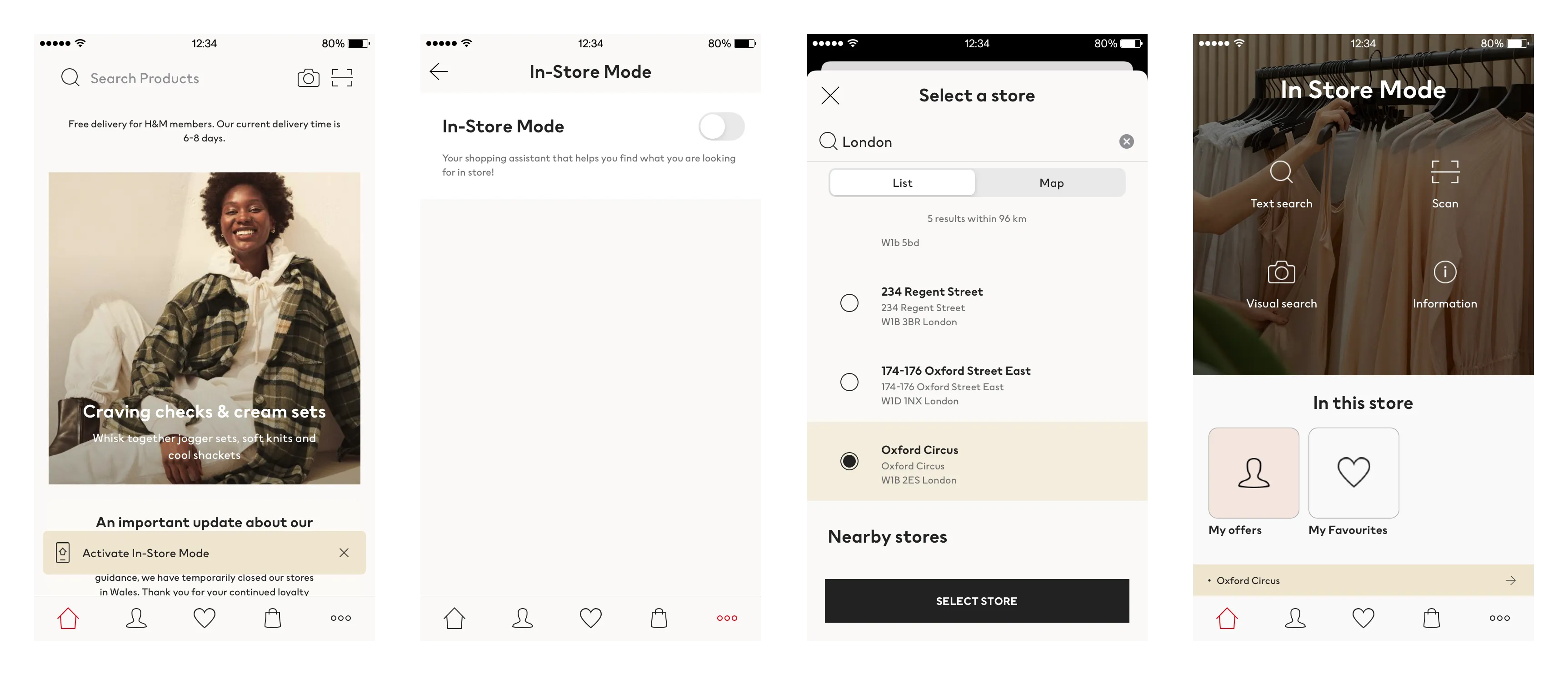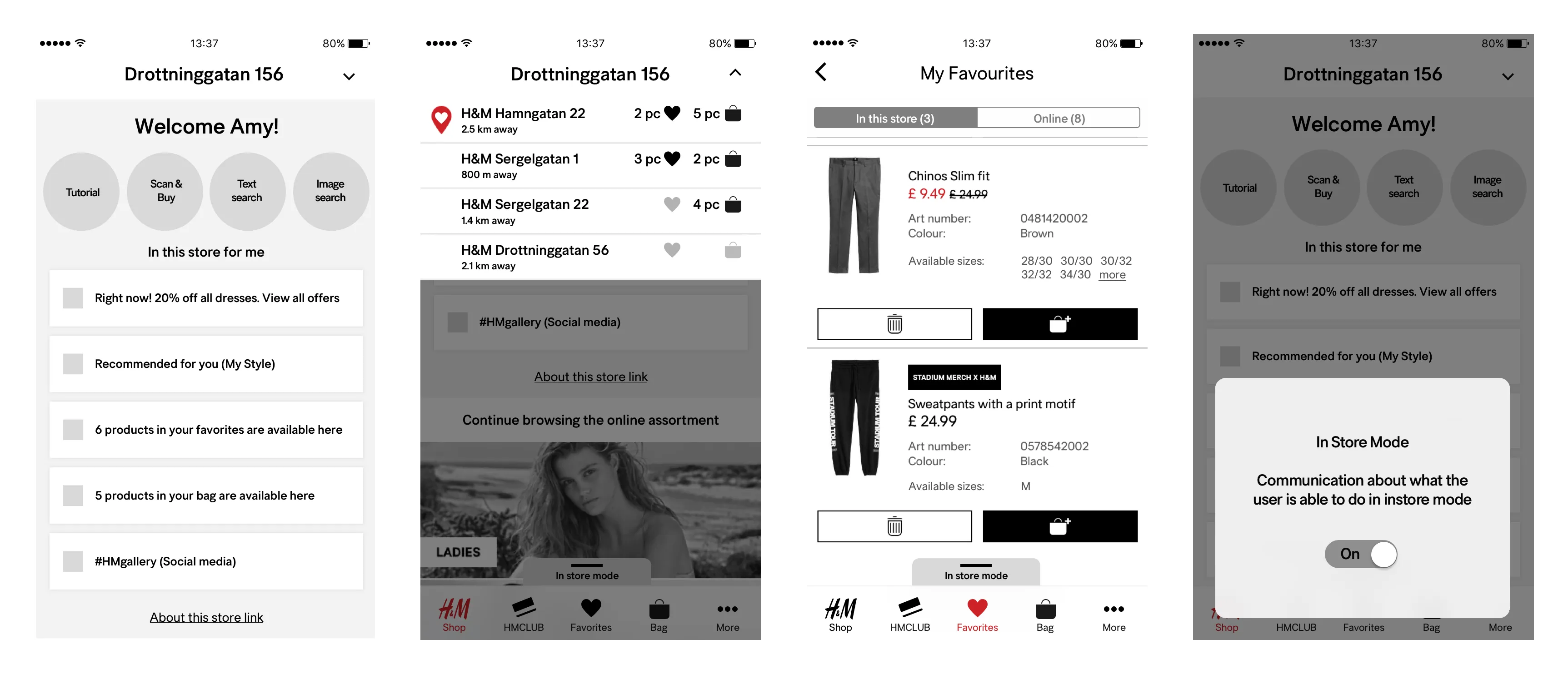 The target context is set at when customers are in any of our physical stores. To faciliate a clear distinction of what our existing mobile application is and what this new functionality could be, we sketched out a layer that sits on top of the current application itself that we called a “mode”. In this “mode”, core interactions surround intentions of finding what customers want in current store, hiding away the rest of functionalities.
